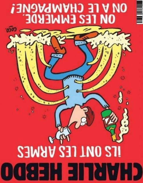 Jeden z korespondentów Makowa zwrócił też uwagę na to, że ostatni plakat Charlie Hebdo (jak wiadomo francuskojęzyczna żydowska gadzinówka) nawiązujący do piątkowych zamachów po odwróceniu wygląda jak menora.